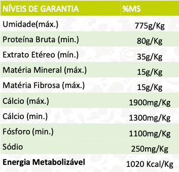 Níveis De Garantia: Umidade (Máx) 775 G/Kg - Proteína Bruta (Mín) 80 G/Kg Extrato Etéreo (Mín) 35 G/Kg - Matéria Fibrosa (Máx) 15 G/Kg Matéria Mineral (Máx) 15 G/Kg - Cálcio (Mín) 1.300 Mg/Kg - Cálcio (Máx) 1.900 Mg/Kg Fósforo (Mín) 1.100 Mg/Kg - Sódio 250 Mg/Kg - Energia Metabolica 1.020 Kcal/Kg