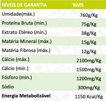 Níveis De Garantia: Umidade (Máx) 760 G/Kg - Proteína Bruta (Mín) 75 G/Kg -Extrato Etéreo (Mín) 38 G/Kg - Matéria Fibrosa (Máx) 12 G/Kg - Matéria Mineral (Máx) 15 G/Kg - Cálcio (Mín) 1.500 Mg/Kg - Cálcio (Máx) 2.100 Mg/Kg - Fósforo (Mín) 1.200 Mg/Kg - Sódio 300 Mg/Kg - Energia Metabólica 1.150 Kcal/Kg