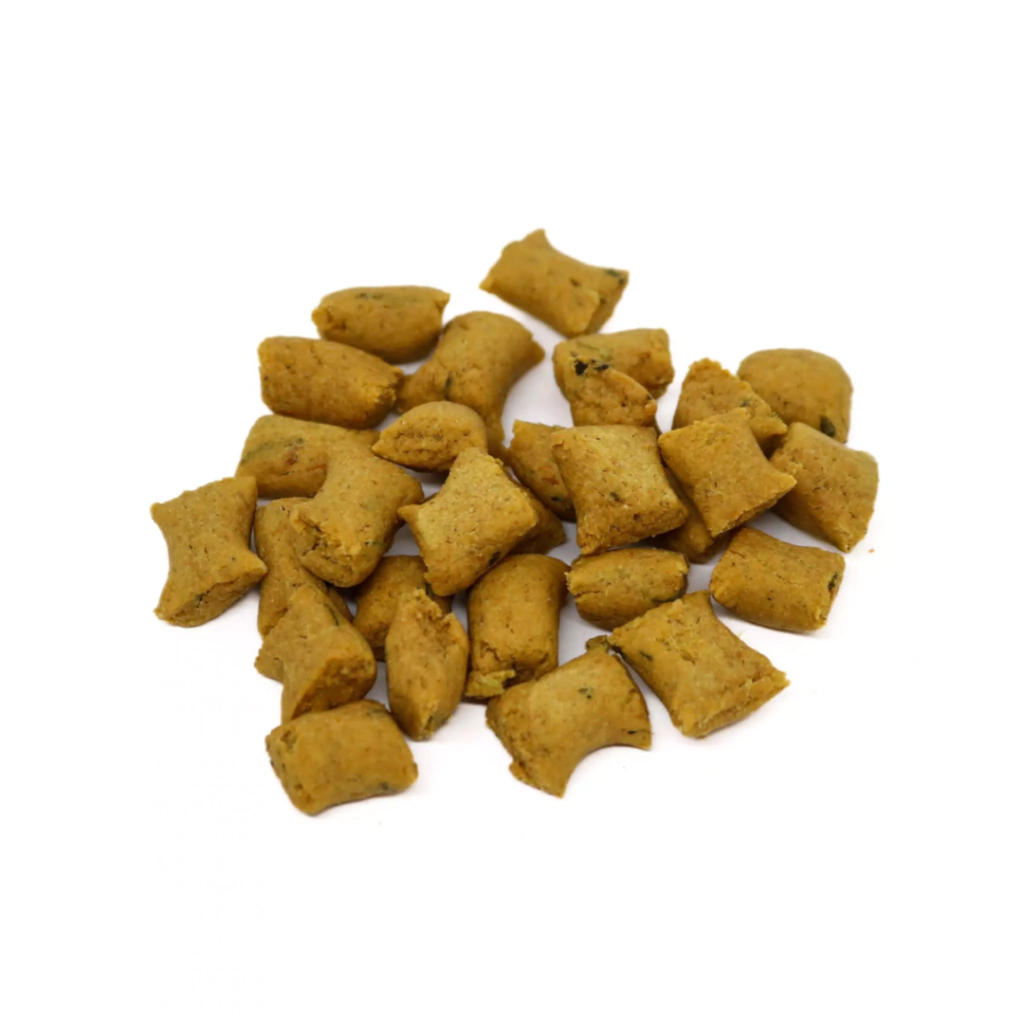 Pode ser oferecido inteiro, em pedaços durante o treino, ou amolecido em água morna para pets idosos ou com dificuldade de mastigação.