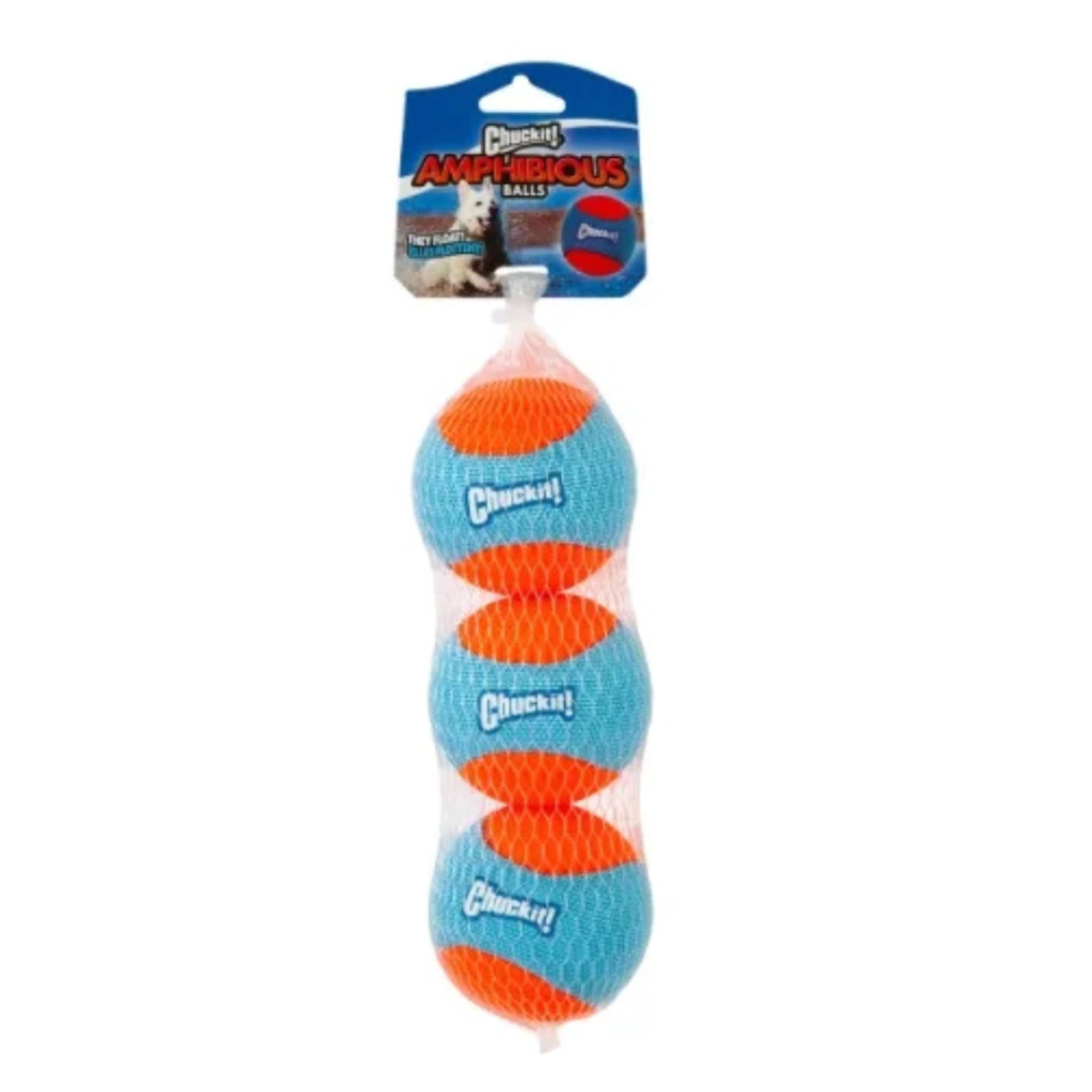 Chuckit! Amphibious Balls é uma bolinha desenhada especialmente para brincadeiras na água. Flutuam sempre bem acima da linha da água, tornando-se fáceis de pegar. Suas cores marcantes as tornam fácieis de serem encontradas em qualquer lugar. Fabricada com materiais muito leves, mas de altíssima qualidade e resistência, podem durar muito tempo, se usadas da maneira adequada. Compatível com arremessadores Chuckit!