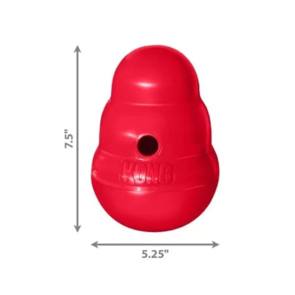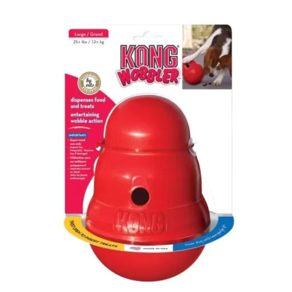 O Wobbler em forma de KONG é um brinquedo cheio de ação e distribuição de comida. Ele fica em pé até ser empurrado pela pata ou pelo nariz de um cão e, então, periodicamente distribui recompensas saborosas enquanto balança, gira e rola. O movimento imprevisível mantém o brinquedo desafiador, mesmo para usuários experientes de Wobbler. O Wobbler também pode ser usado como uma alternativa para uma tigela de cachorro para ajudar a diminuir e estender o horário das refeições enquanto fornece exercícios para seu cão. Desaparafusa para fácil enchimento e limpeza.