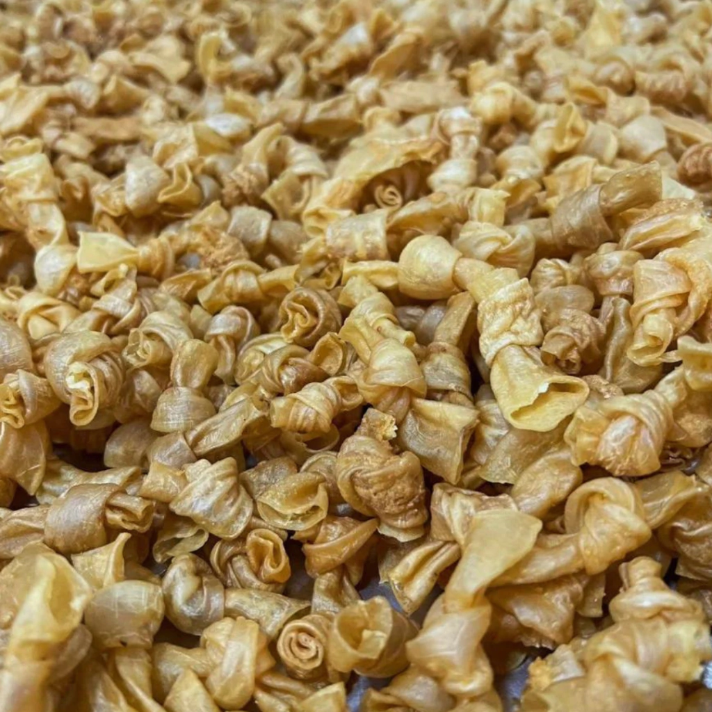 Nozinho Bovino: Petisco de agrado feito de tripa bovina. Muito palatável.