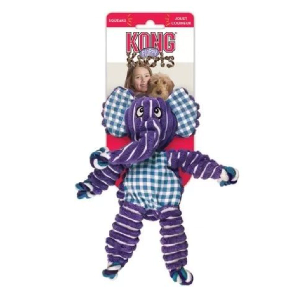 KONG FLOPPY KNOTS® é um brinquedo feito com os ingredientes mais seguros e resistentes do mercado. Esses brinquedos macios, porém resistentes, possuem em seu interior uma corda com nós, que satisfazem instintos naturais dos cães, além de possuir estufagem mínima, evitando bagunça caso o cão consiga perfutar o brinquedo. Contém um apito para tornar a brincadeira ainda mais animada e estimulante para o cão. Desenvolvido para cães de mordida moderada ou leve. Para cães com mordida destrutiva, opte por brinquedos KONG de borracha.